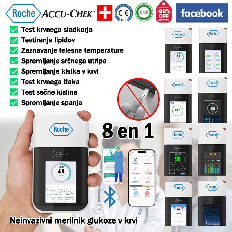 Posledice visokega krvnega sladkorja so katastrofalne, saj povzročajo glavobole, bolezni srca in ožilja, visok krvni tlak, bolezni ledvic in drugo. Bolniki morajo spremljati svojo prehrano in občasno spremljati raven sladkorja v krvi, vendar so akupunkturne metode merjenja bolniku manj prijazne. Rochejev neinvazivni multifunkcijski glukometer vam bo zagotovo pomagal znebiti se vaše bolezni. Enostaven za uporabo. Preprosto položite prst na označeno mesto in samodejno bo izmeril vaš krvni sladkor.